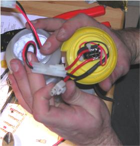 Jetzt wird die Flasche etwas umgebaut so dass der Schalter in den Deckel passt. Der Sigma sauschwere Bleiakku darf jetzt sein Kabel hergeben, das brauchen wir! Jetzt Kabel und Schalter verlöten. Hier ein Trick von CK T.E. Kretz. Es wird eine Diode mit an den Schalter gelötet, diese "klaut" 0,7 Volt die zuviel sind. So ein Modellbau Akku hat 7.2 Volt und die | ||||||||||||